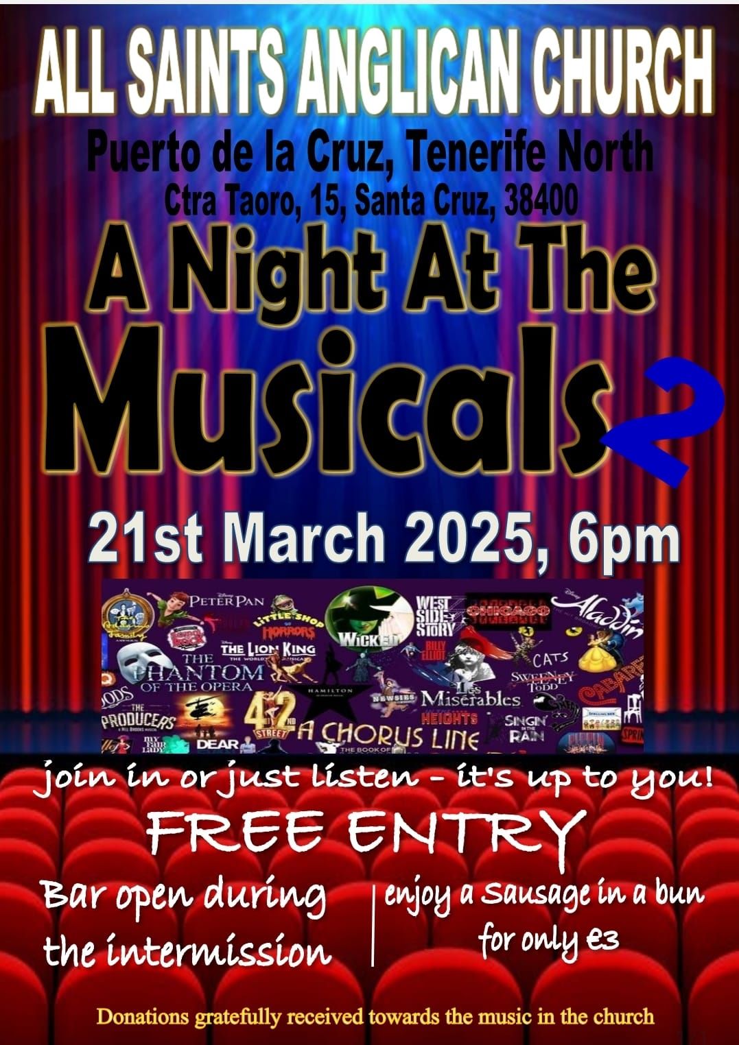 A Night At The Musicals 2 at the All Saints Church Posted on March 10, 2025March 11, 2025 by admin Join in another fabulous singalong musicals evening at The All Saints Church with a bar and a Sausage in a Bun available at the interval.Get Directions