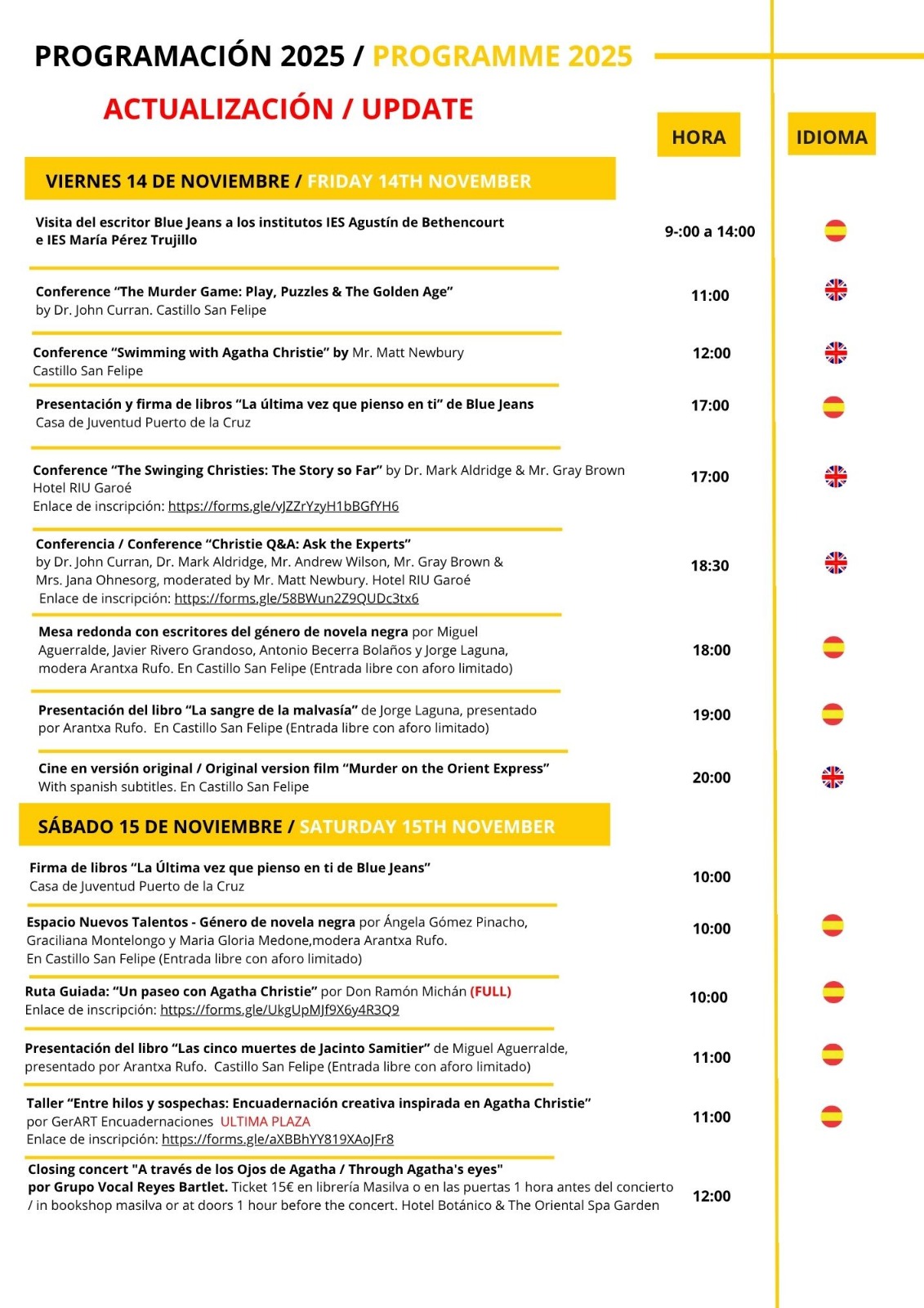 From 9 to 15 November 2025, the city transforms into a hub of literature, mystery, theatre, and cultural exploration. The festival pays tribute to Agatha Christie’s visit to Tenerife in 1927, blending her legacy with the island’s natural beauty and creative spirit.