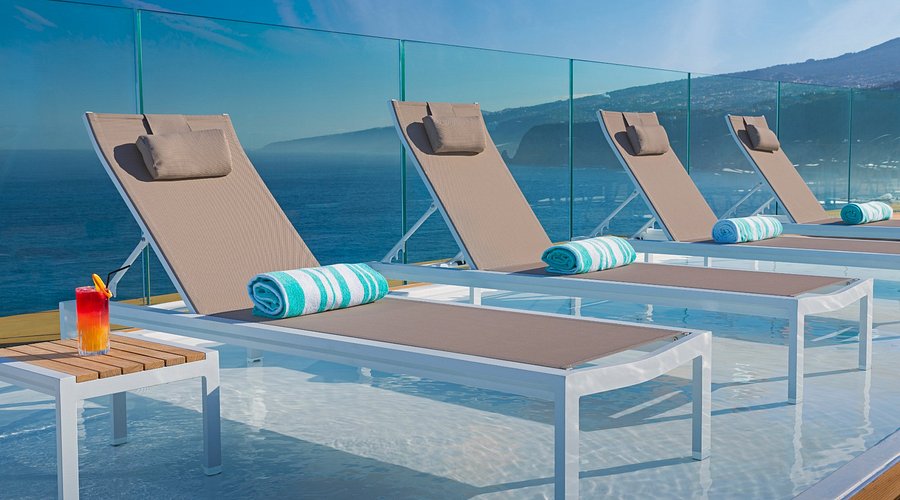 The outdoor pool area offers wide ocean views and a relaxed sunbed layout.
