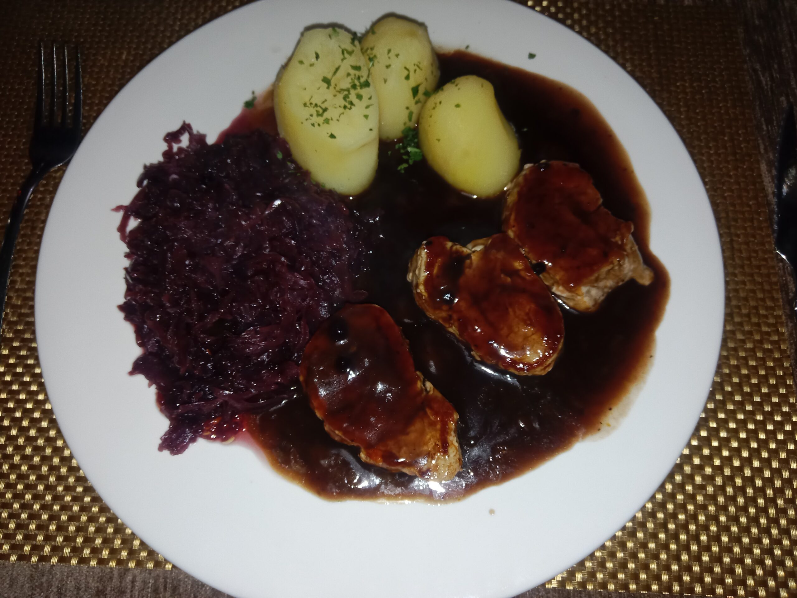 As this is a regular of ours, there are certain favourites that I like – including the salmon in bearnaisse sauce and the pork in blueberry sauce. This time round I opted for the pork in blueberry sauce which comes with most divine red cabbage and new potatoes. Served hot, and in a timely but not rushed manner, it is always a firm favourite with me.