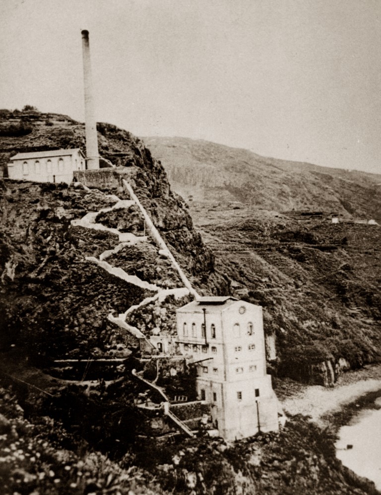 Built on the former location of Juan de Gordejuela mill right next to the Gordejuela waterfalls, the building was built by the Hamilton family in 1903 at a cost of 1 million pesetas to pump water from the Gordejuela springs to provide fresh water for the banana plantations up in the Orotava Valley and to also power a flour mill. The pumping system was powered by the first ever steam engine on the island of Tenerife. The water was pumped to the top of the cliff, some two hundred meters (six hundred and sixty feet) above the sea level by the steam engine. The water was then stored in a reservoir which was approximately two kilometers (approximately 1.2 miles) away which had a capacity of 12,000 cubic meters (which is approximately 420,000 cubic feet). The water was then transported via a twelve kilometer aqueduct to the banana plantations.