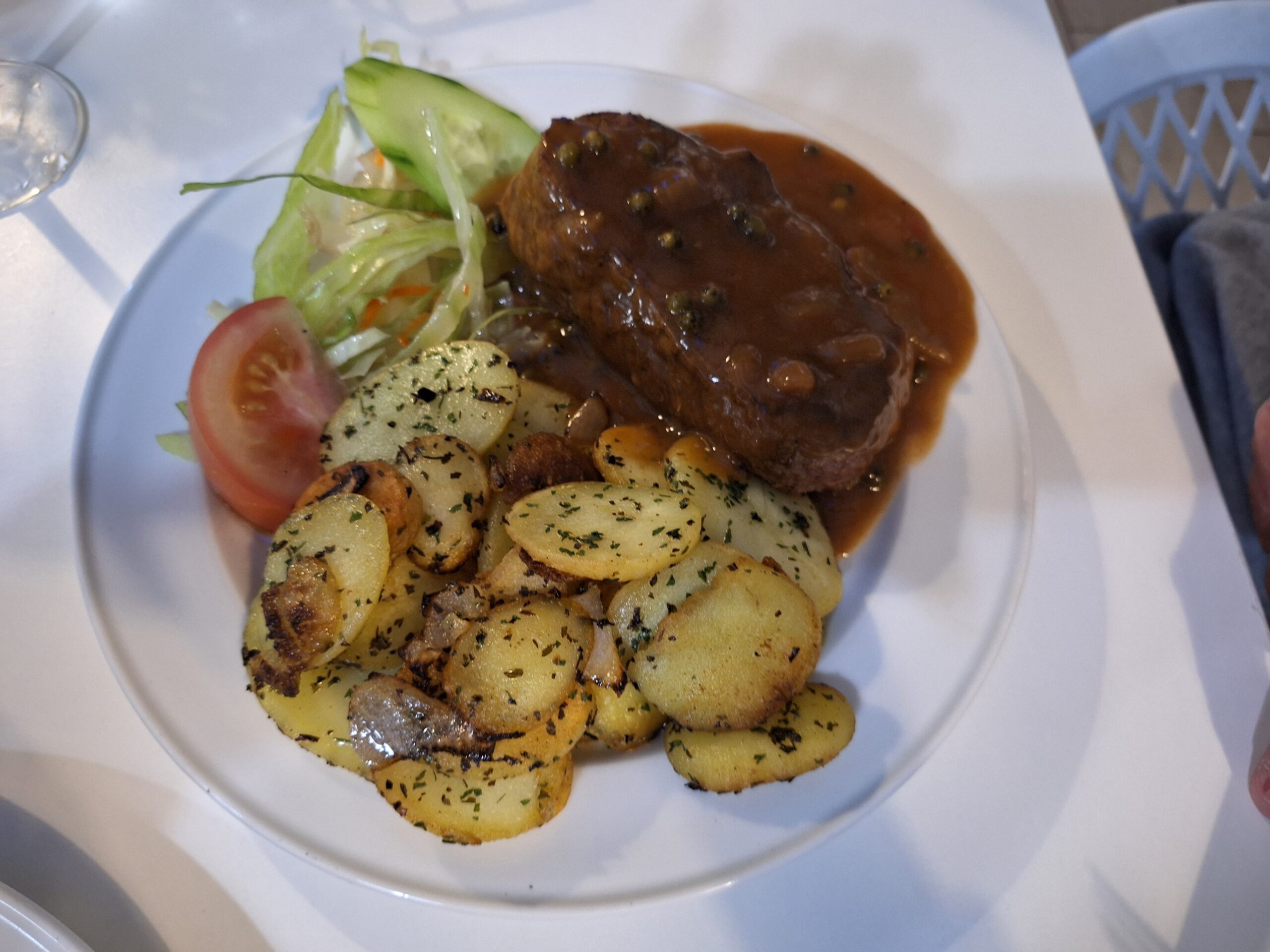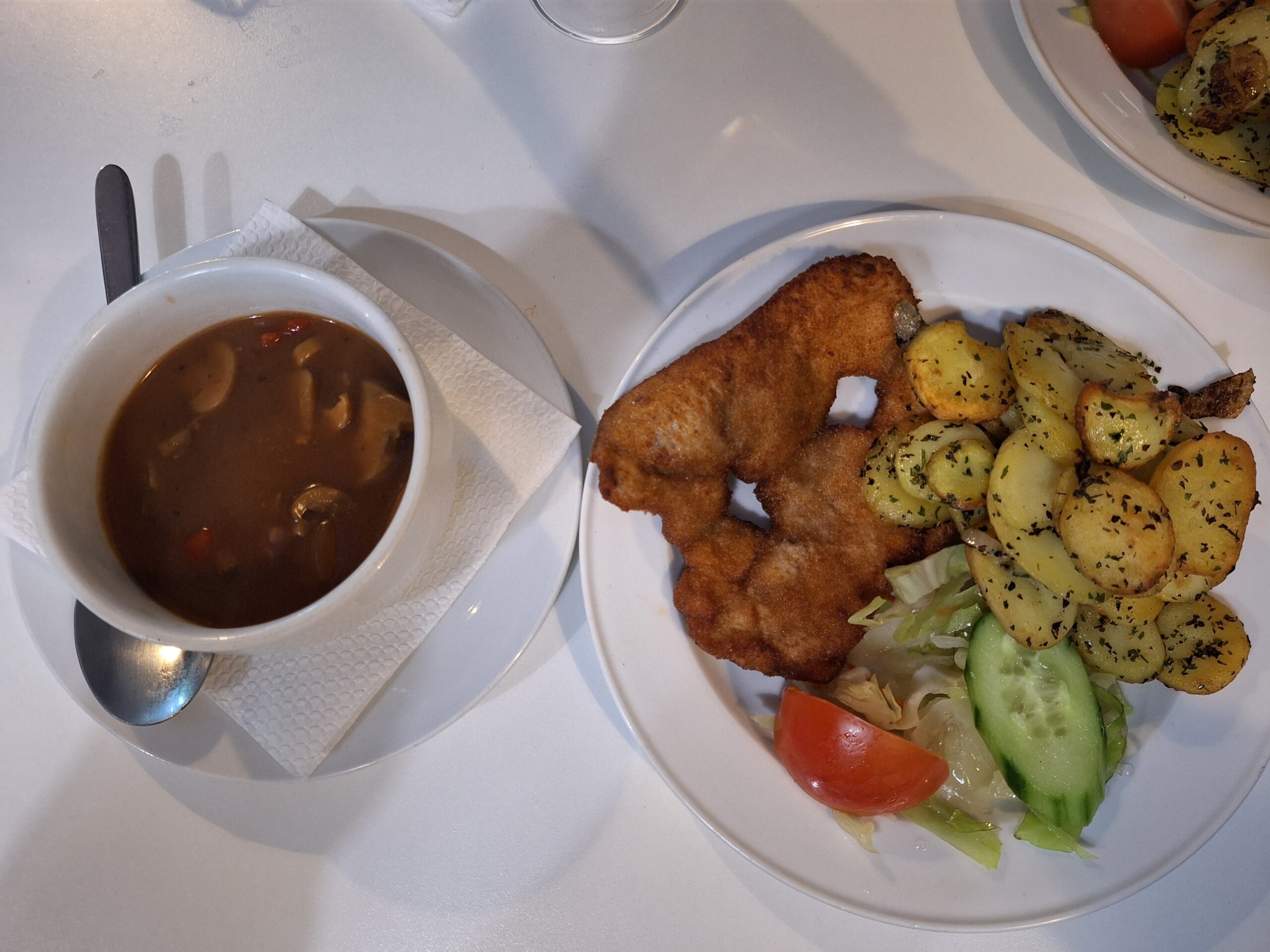 I opted for bread pork fillet, salad and sauteed potatoes and paid extra for some mushroom on the side which they very kindly supplied. The food was great, especially the potatoes. The only comment I would have is that the plates could do with being bigger!