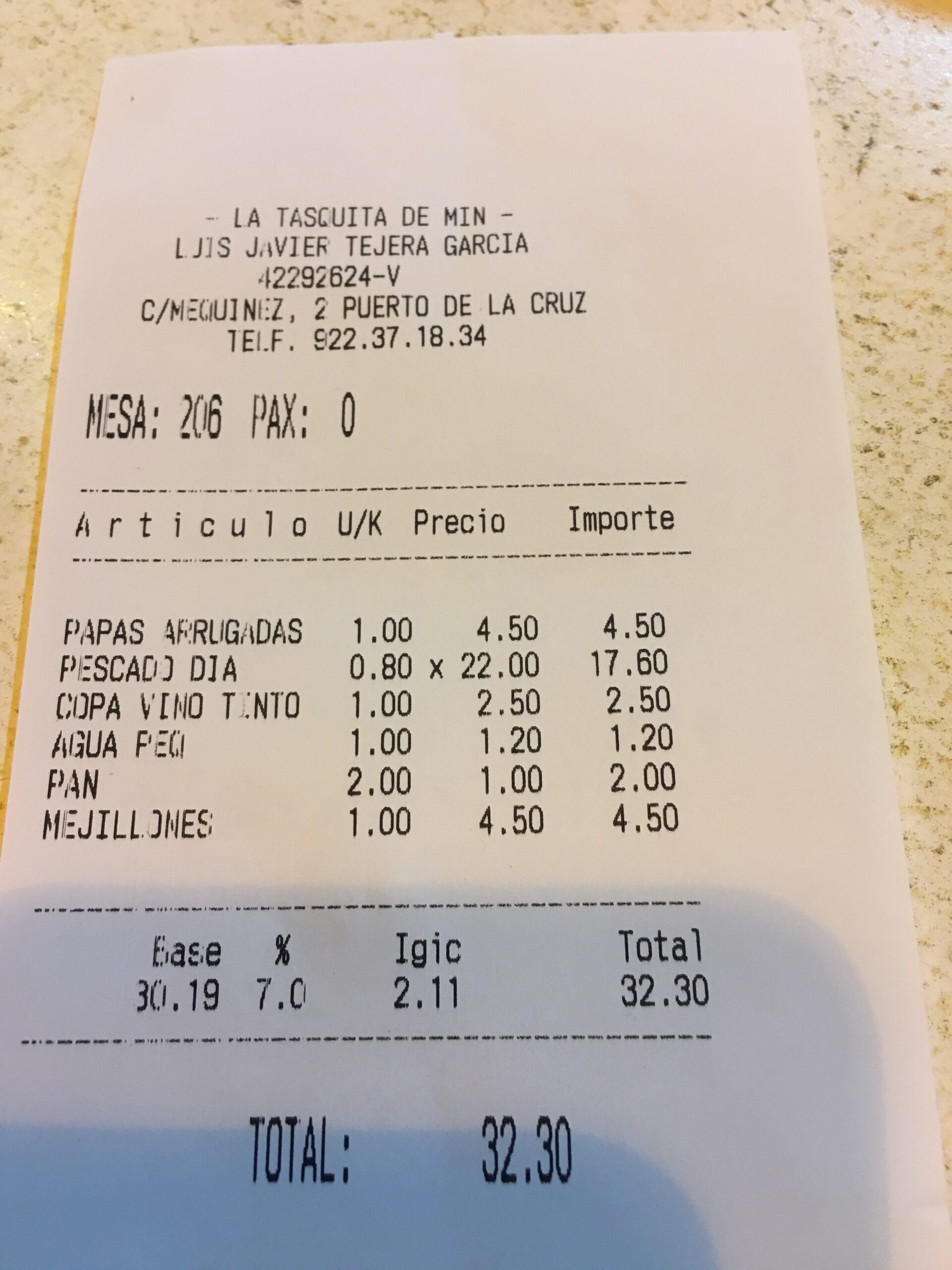 I was very disappointed with the mussels. They were over cooked, quite rubbery and rather expensive as there was only four for 4.50€. Husband loved his fish however. Perfectly cooked. He wasn't asked what he would like to accompany his fish and to be charged 4.50€ for papas arrugadas, we felt was rather a cheek.