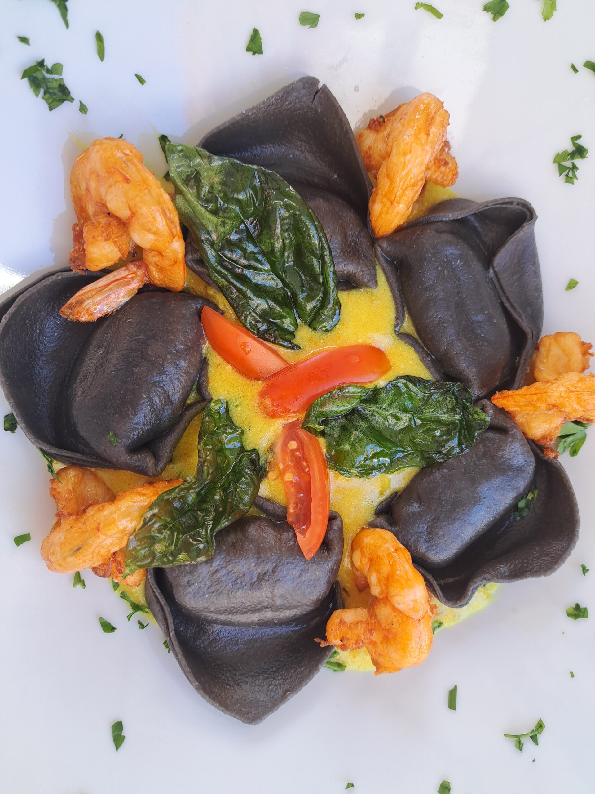 We followed up with black ravioli (a new one for me) stuffed with salmon in a curry tasting sauce which was very tasty (I shall be going back to have this again!)Ā We also enjoyed pasta in a creamy sauce.