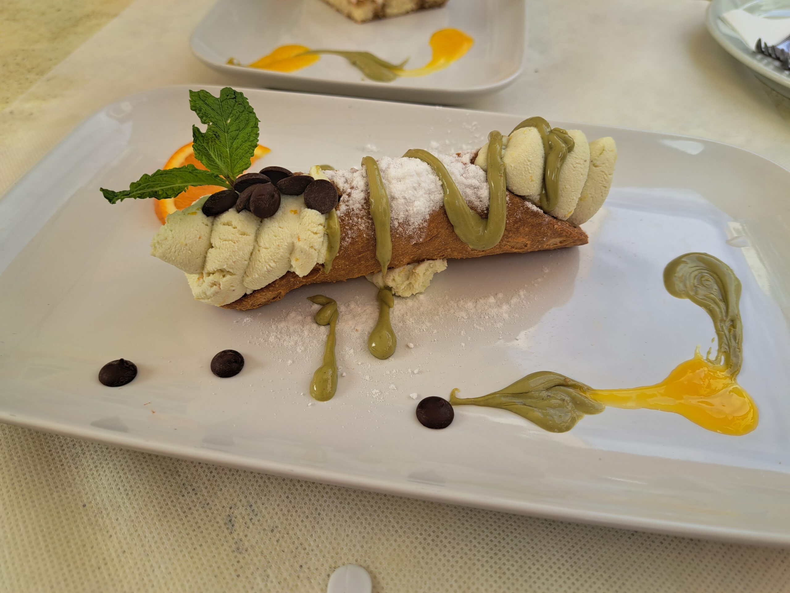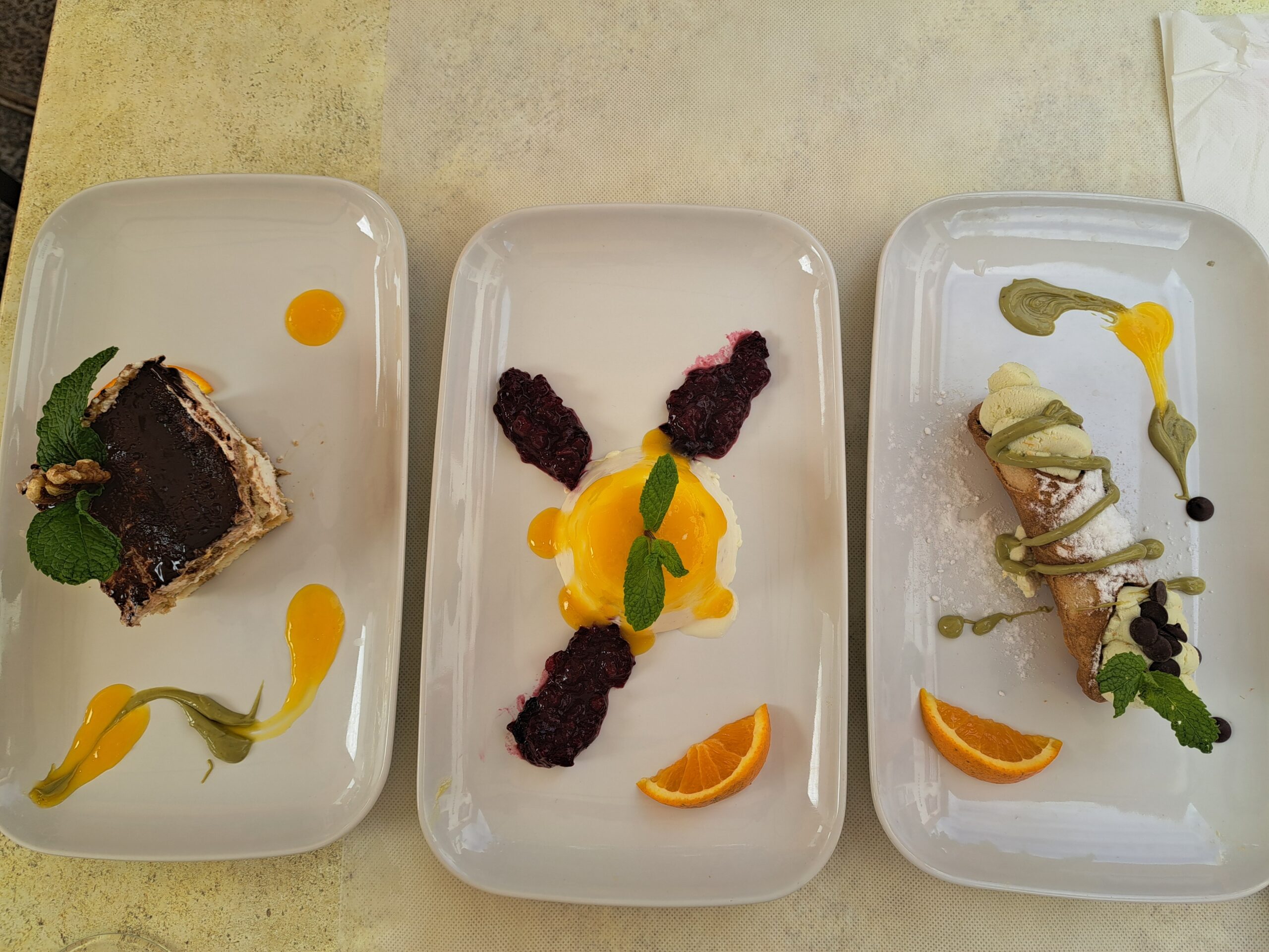 If that wasnāt enough, we sampled a trio of desserts ā tiramisĆŗ, panna cotta (served with berries and mango marmalade) and sicilian cannolo (cookie tube filled with ricotta, chocolate, pistachio cream and fruit) ā all very tasty.