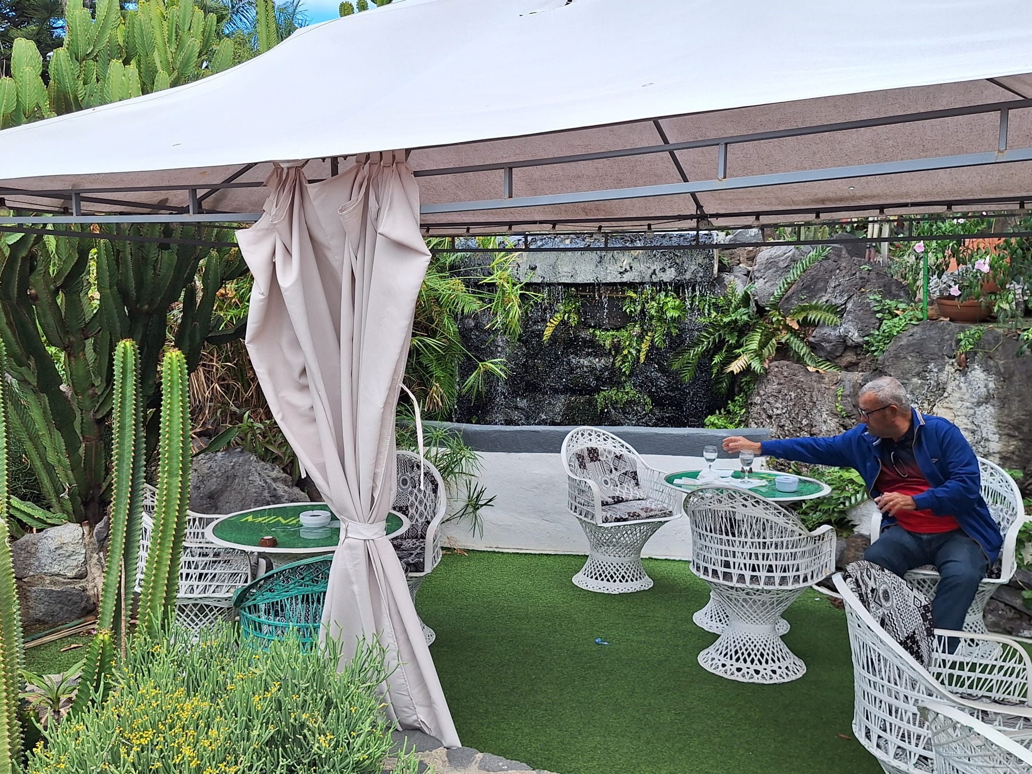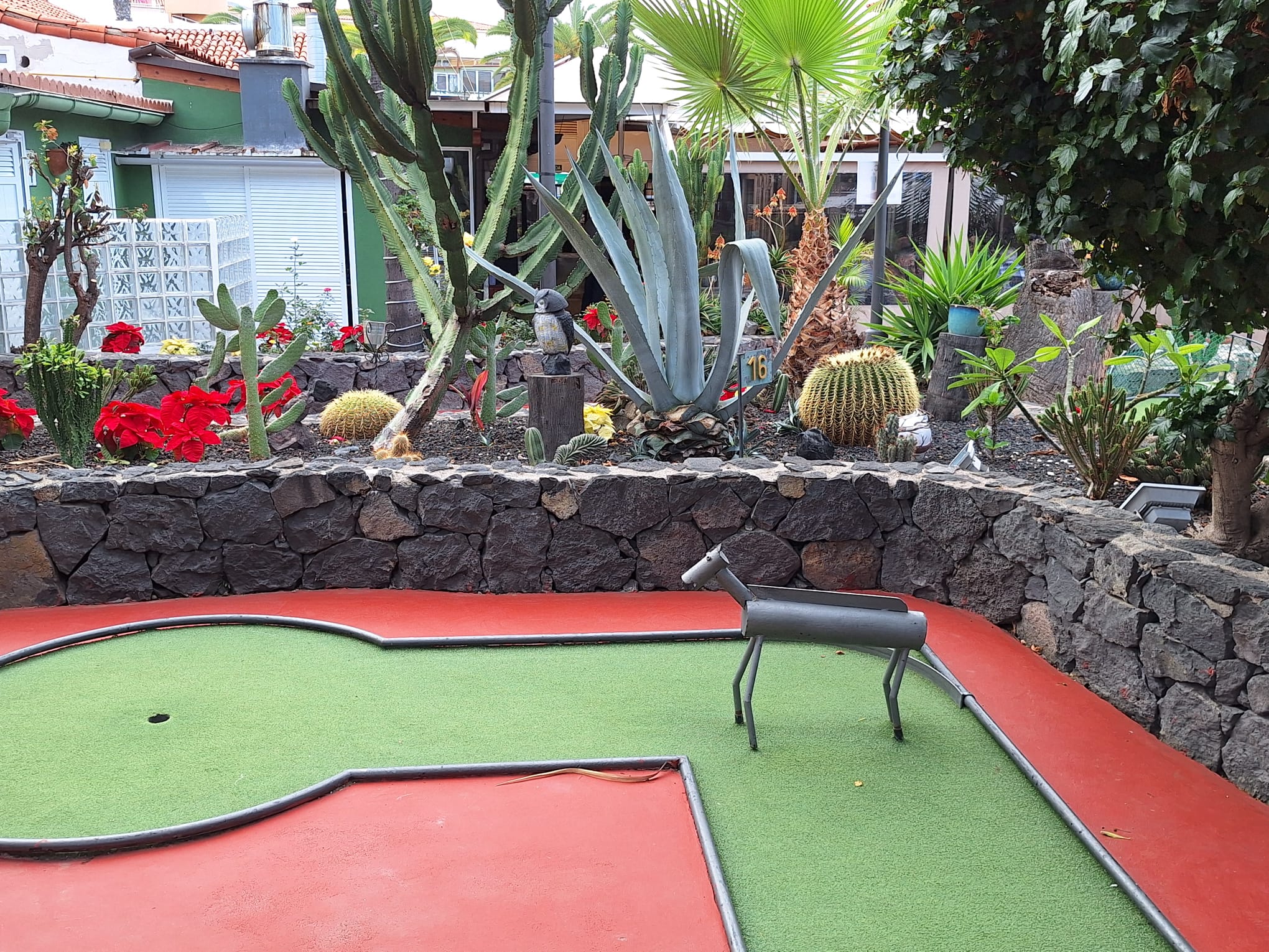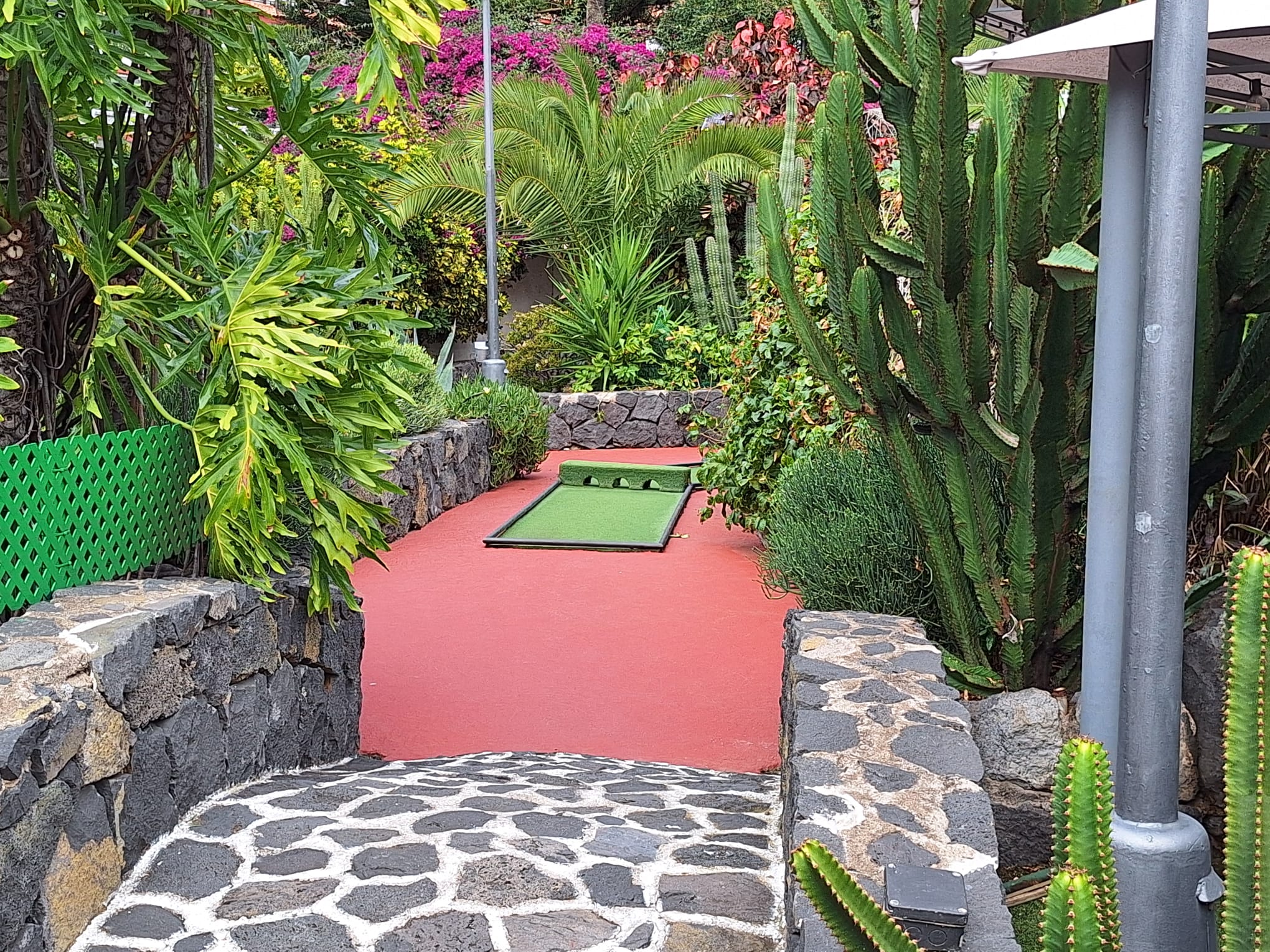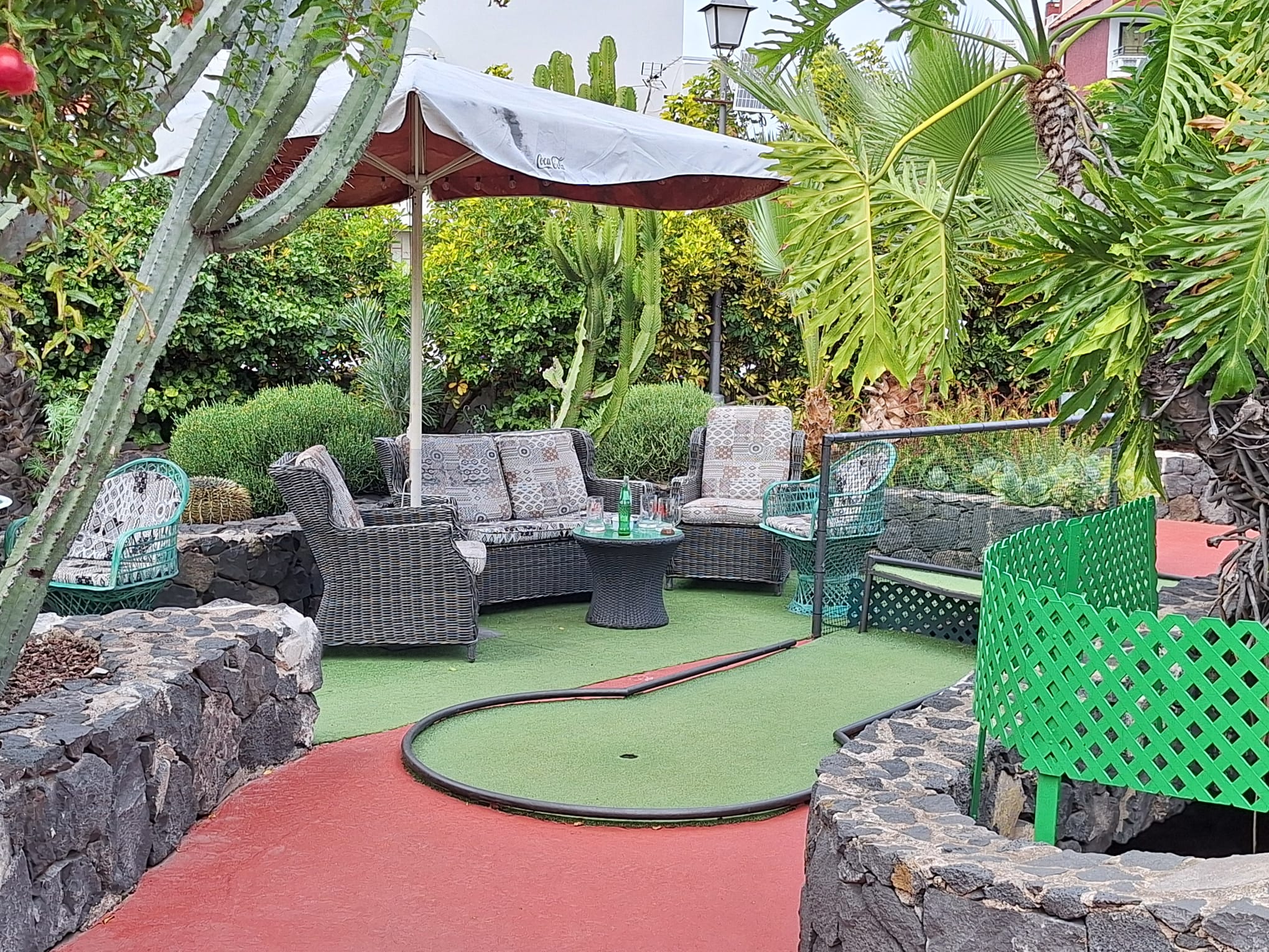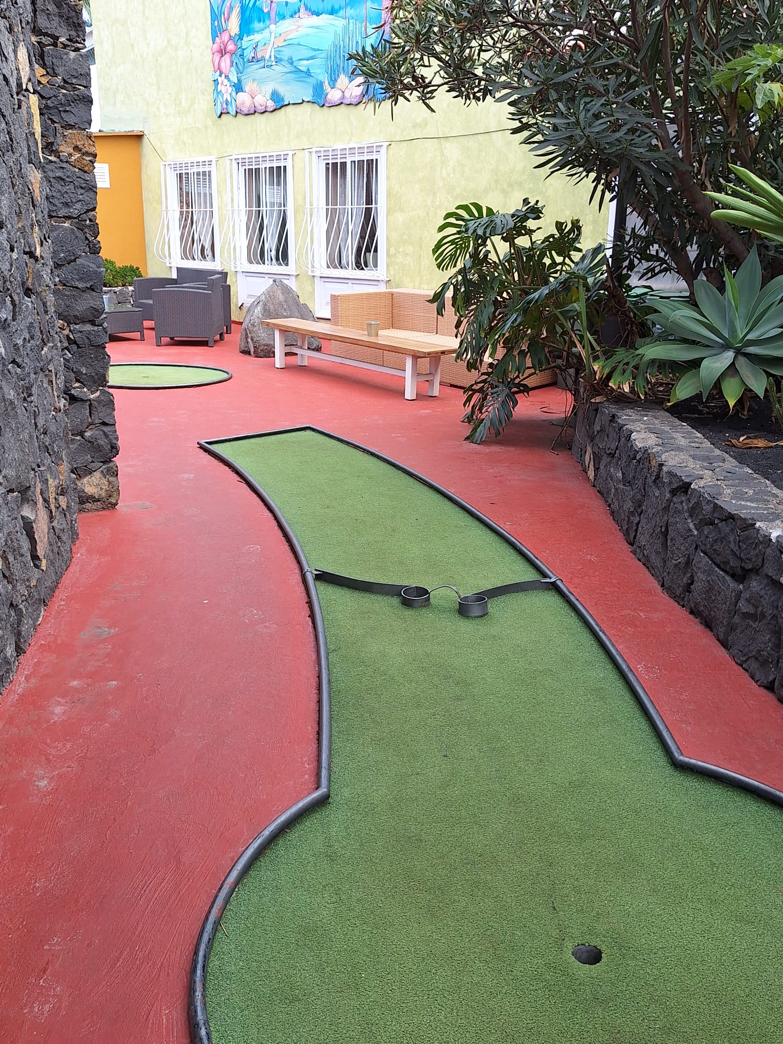 A round of mini golf costs 4,50€ per person. In the past it was always free if you had eaten a meal in the restaurant. I think the fact that there was a charge reflected in how few people were playing. When it was free, it was always very busy and a super place to come to with children for a family meal. That aside, the golf area is very well maintained, with some colourful plants, gardens and a waterfall making it a lovely spot to sit and enjoy a meal or just a drink.