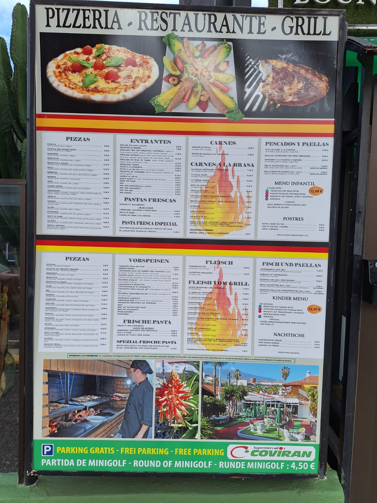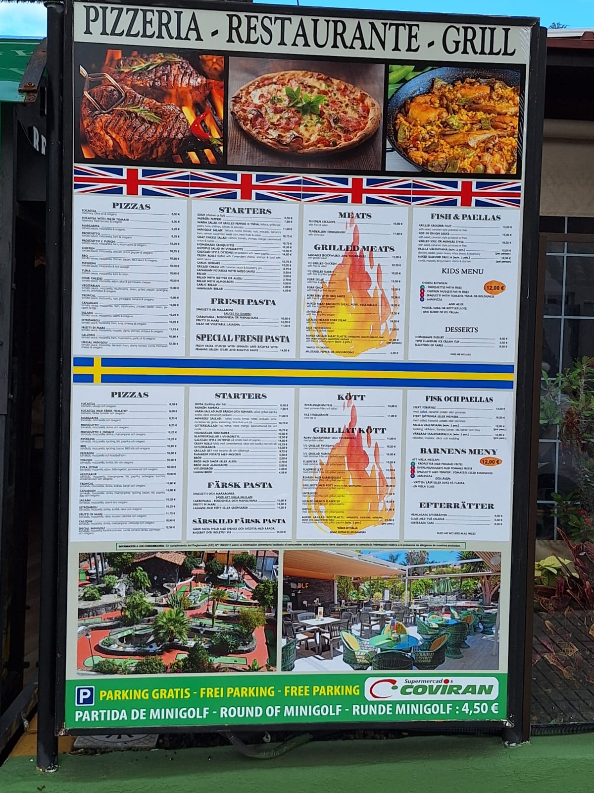 The menu offers the usual selection of pizzas, fresh pasta with various sauces, selections of starters, grilled meats, fresh fish and paella. There is also a children’s menu too.