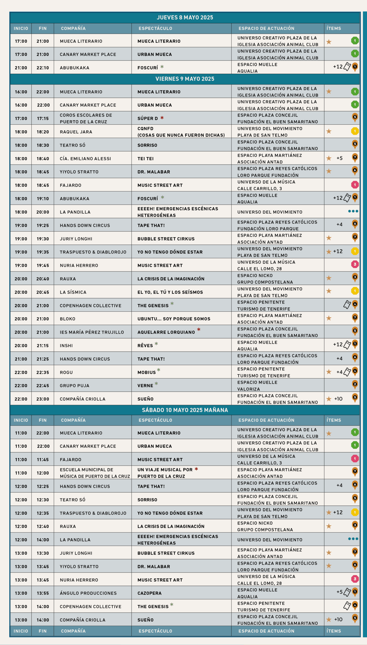 The Puerto de la Cruz International Street Art Festival, MUECA, will celebrate its twenty-third edition from May 8 to 11. During these four days, the city will once again become a grand open-air stage where international, national, and regional artists and companies will bring their theater, music, dance, and street arts performances to life.