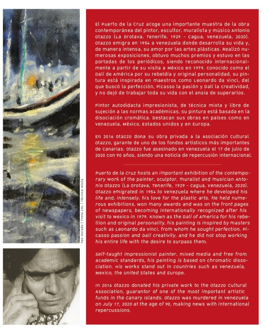 🎨Antonio Otazzo Padrón was a magnificent self-taught painter, sculptor, muralist, poet and musician from Orotava. His work is inspired by the perfection of Leonardo Da Vinci, the passion of Pablo Picasso and the creativity of Salvador Dalí. His painting is based on chromatic dissociation, standing out in countries in Europe, Venezuela, Mexico and the United States. In 2016, Otazzo donated his private work to the Otazzo Cultural Association, guarantor of one of the most important artistic collections in the Canary Islands.