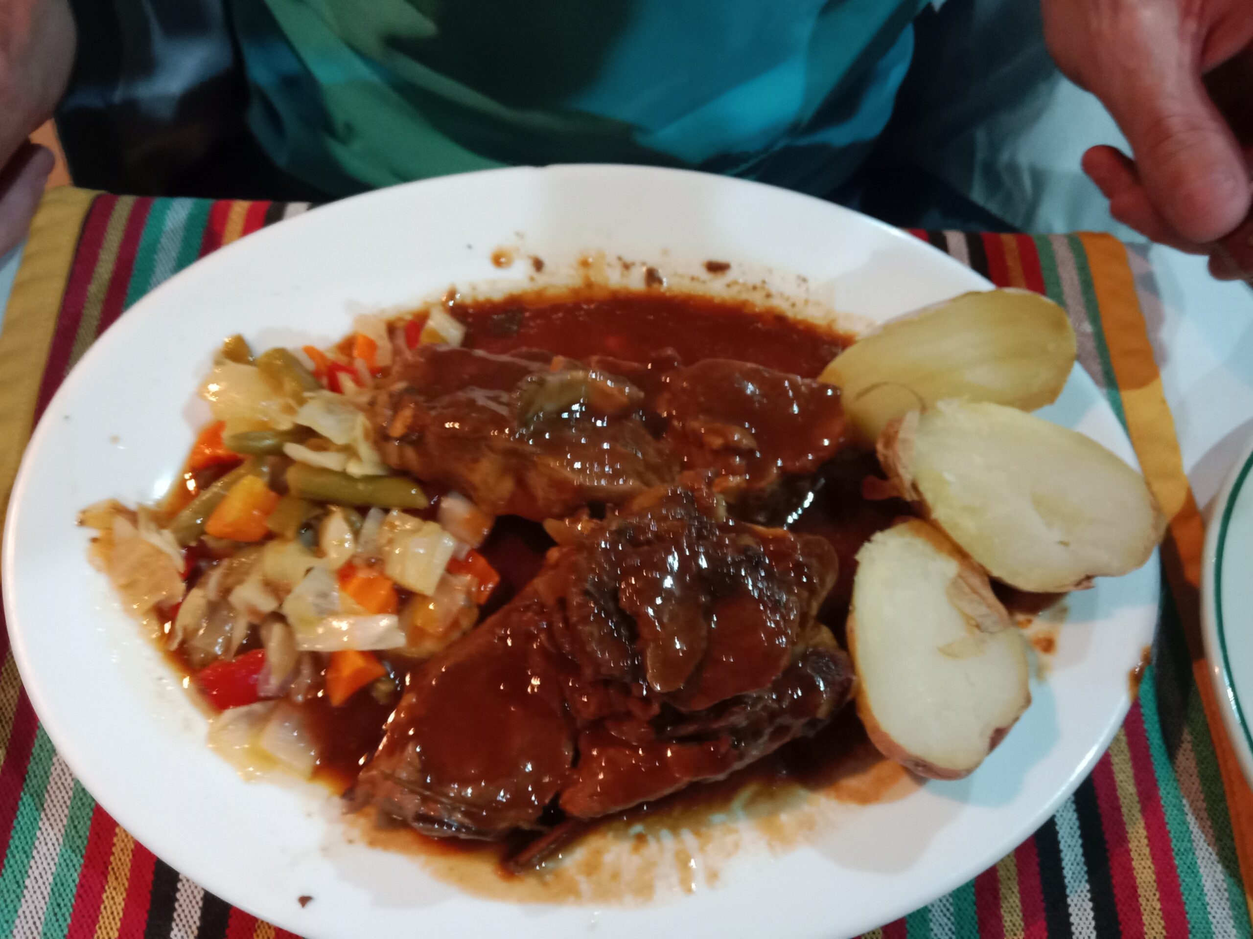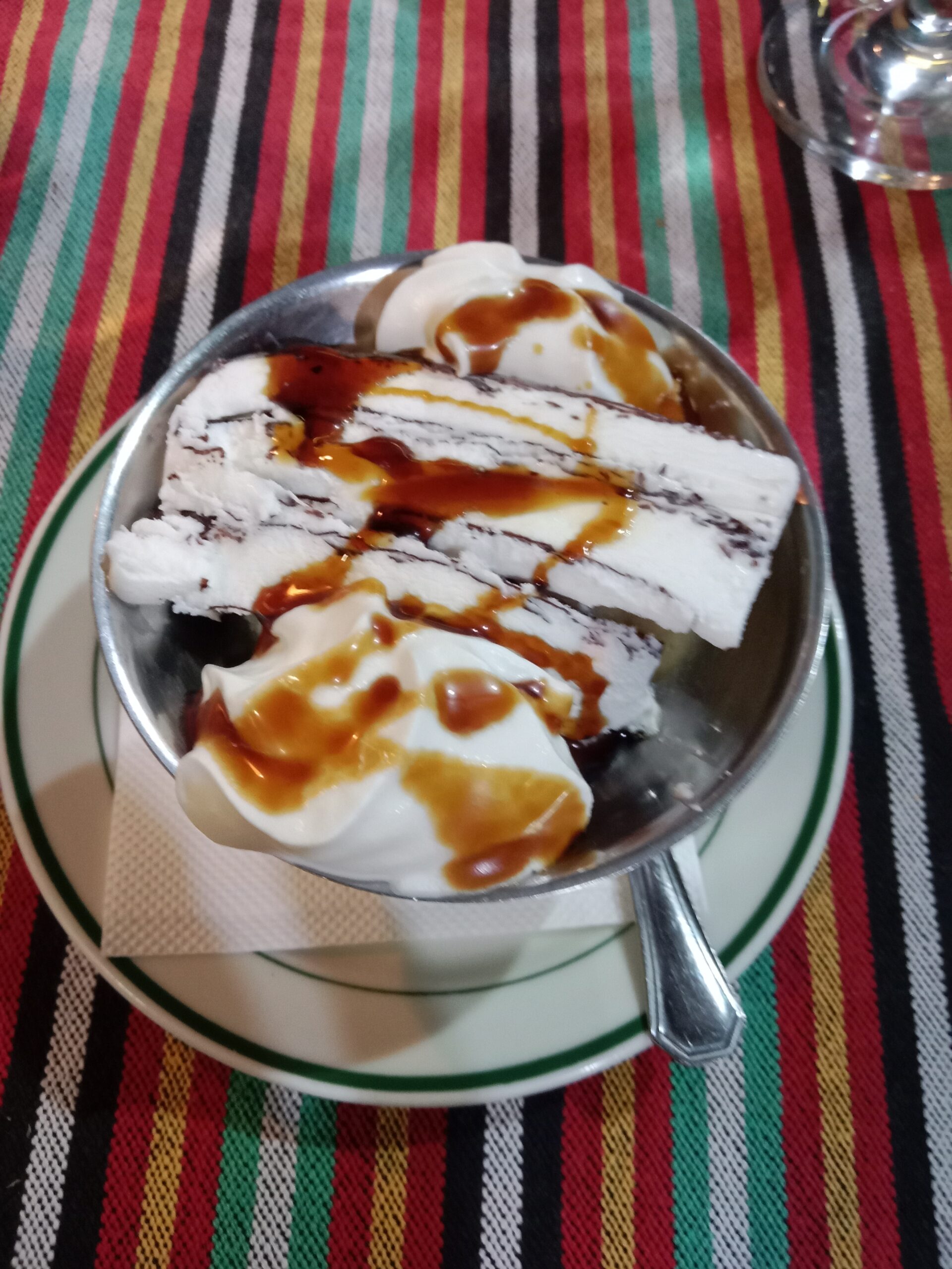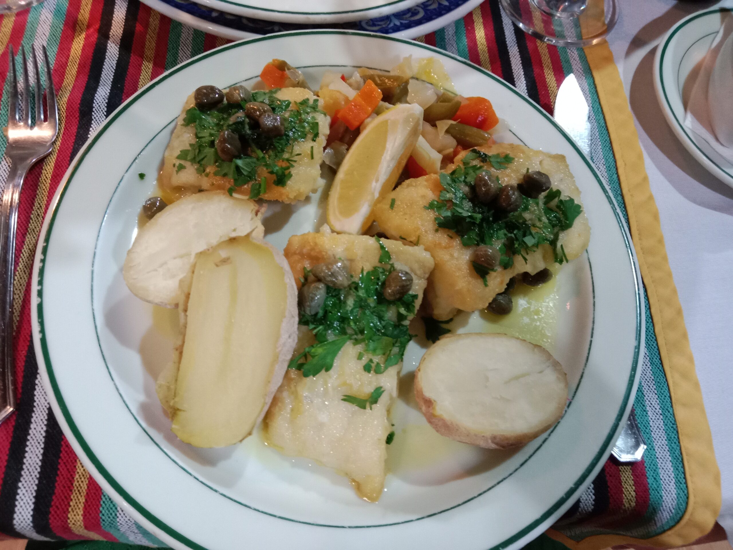As a main course, my partner enjoyed a rather large lamb shoulder in a local “gravy” served with potatoes and fresh vegetables. I have the filet of fish meuniere also served with potatoes and fresh vegetables. The food was excellent, and the portions were generous.