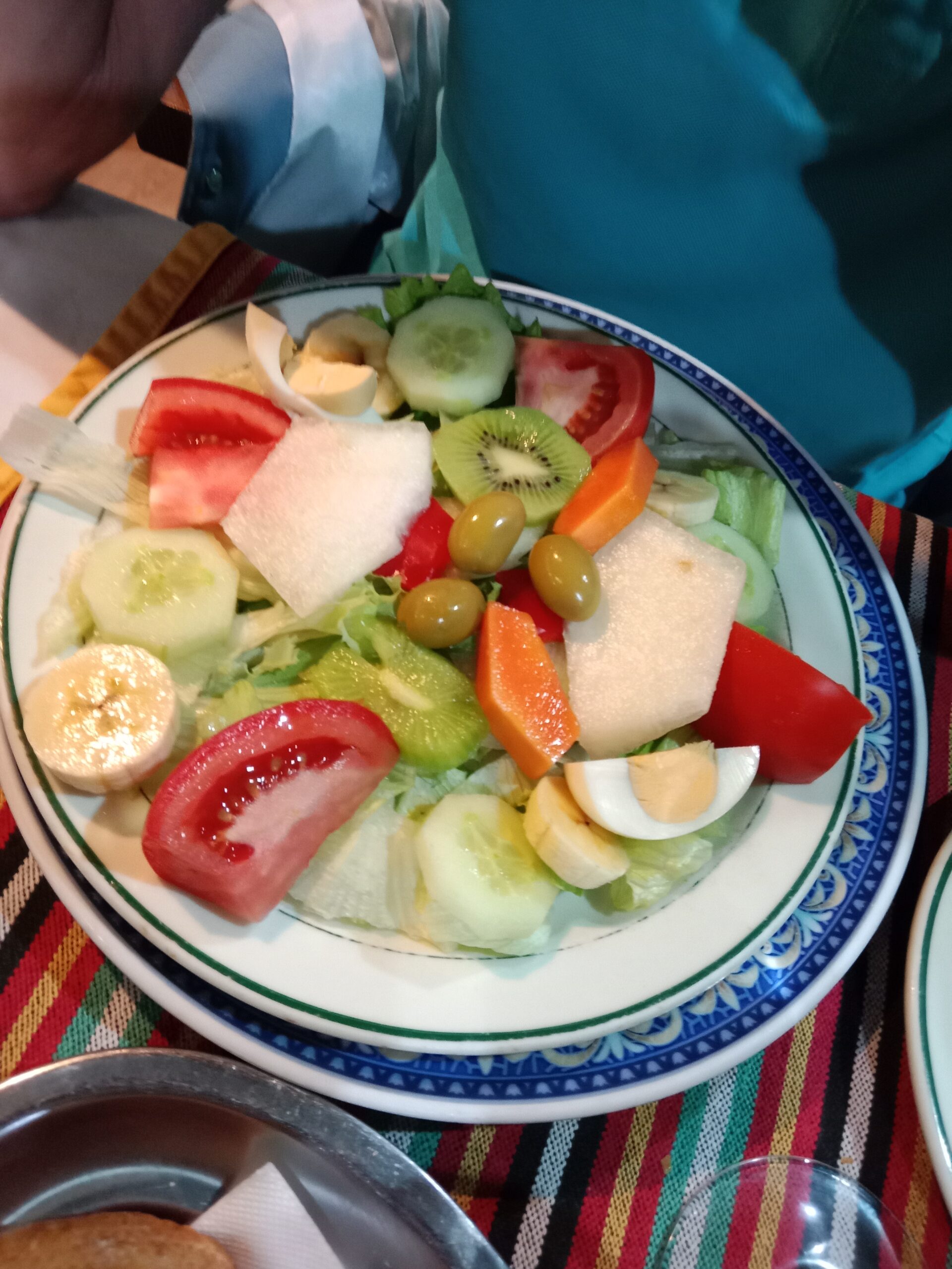 I opted for prawns in garlic for a starter which arrived in the expected sizzling manner. My partner had a mixed salad which was refreshingly different consisting not just of the usual lettuce, tomato and cucumber but also egg, kiwi, papaya and melon!