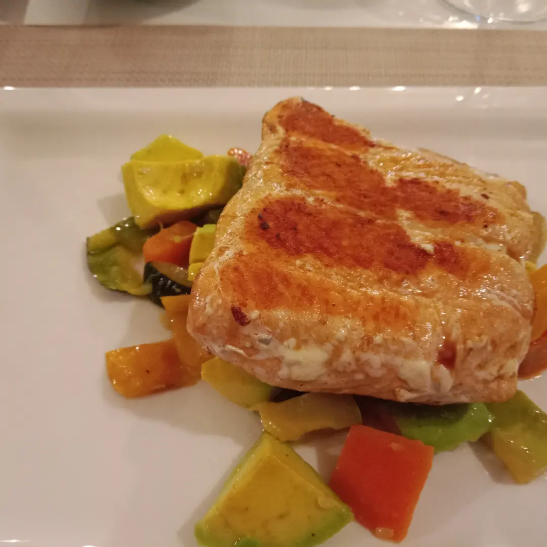 I had the salmon with avocado and vegetables – which was very well presented. I had to order some potatoes separately as the meal only came with the vegetables. The salmon was a lovely, a nice thick piece and the selection of vegetables was great. My partner was not very hungry so he opted for the onion soup with some garlic bread. The soup came out very hot and was really tasty.