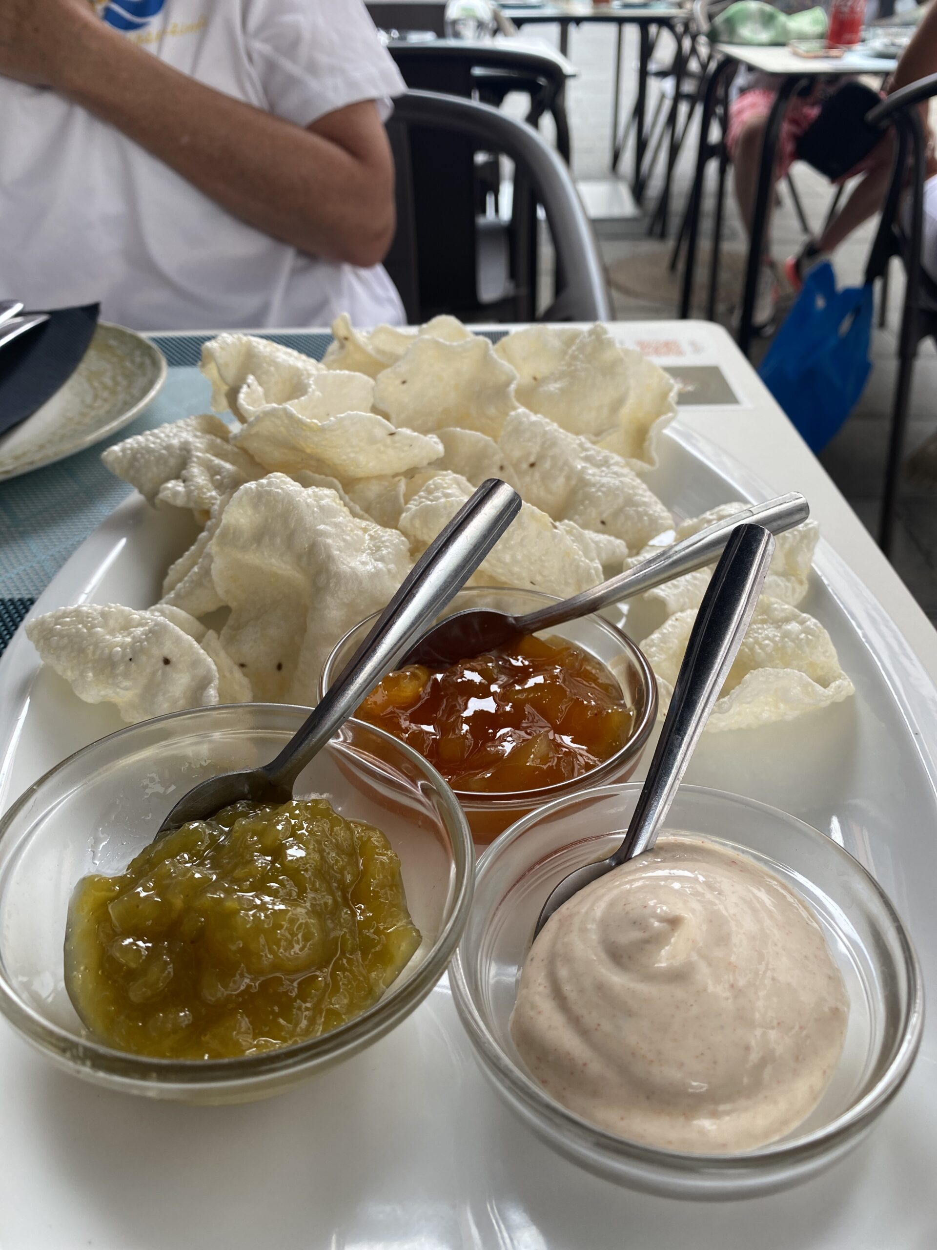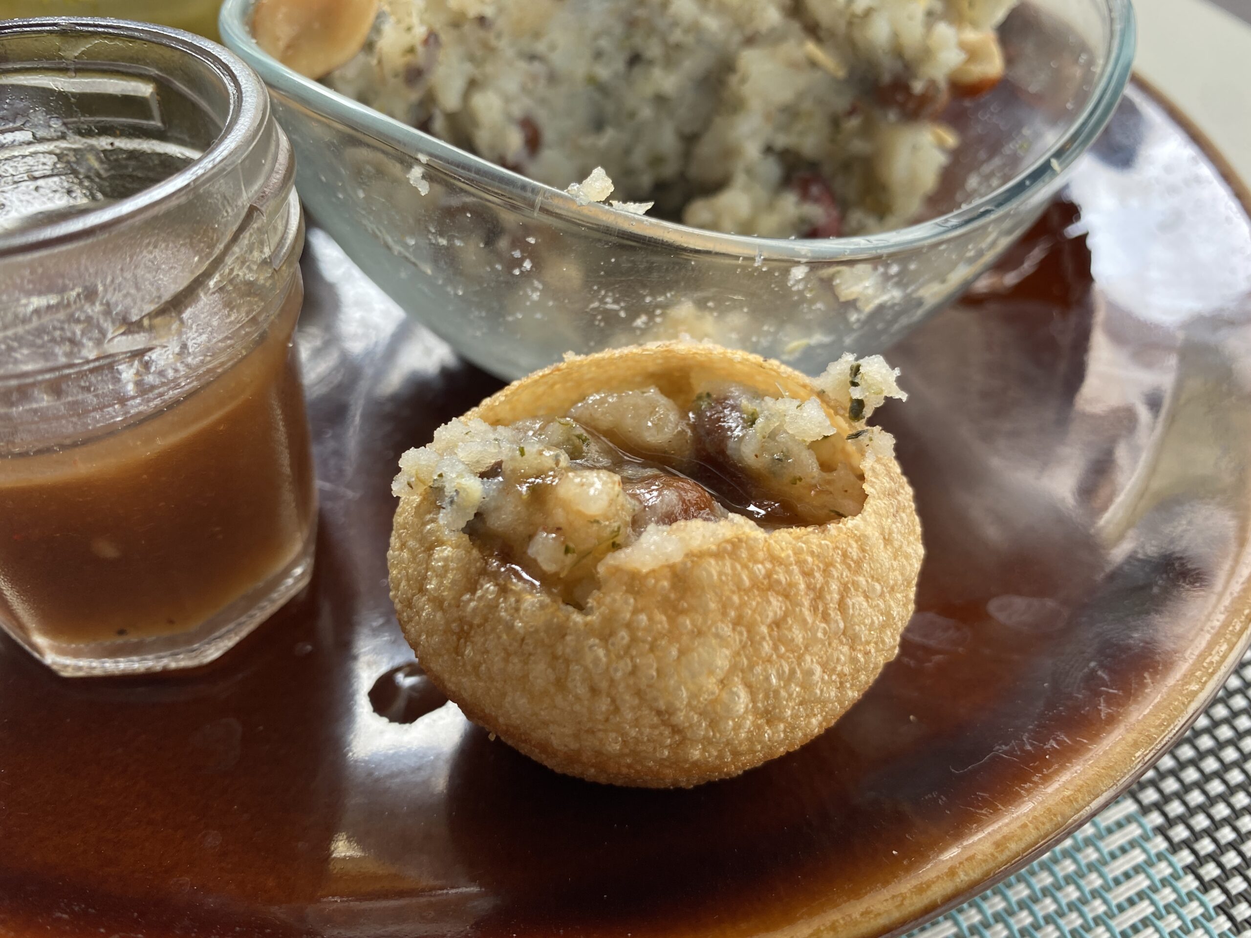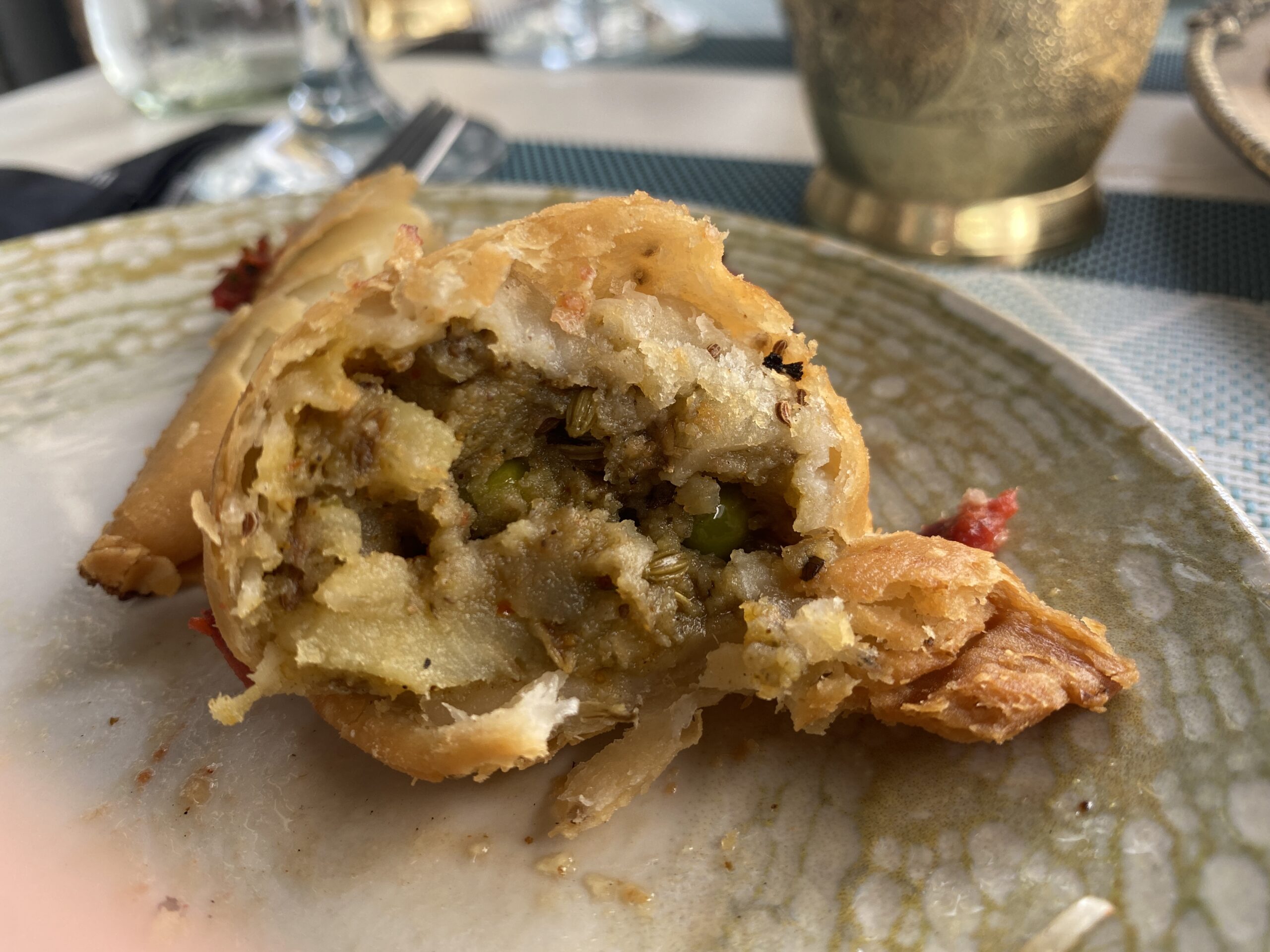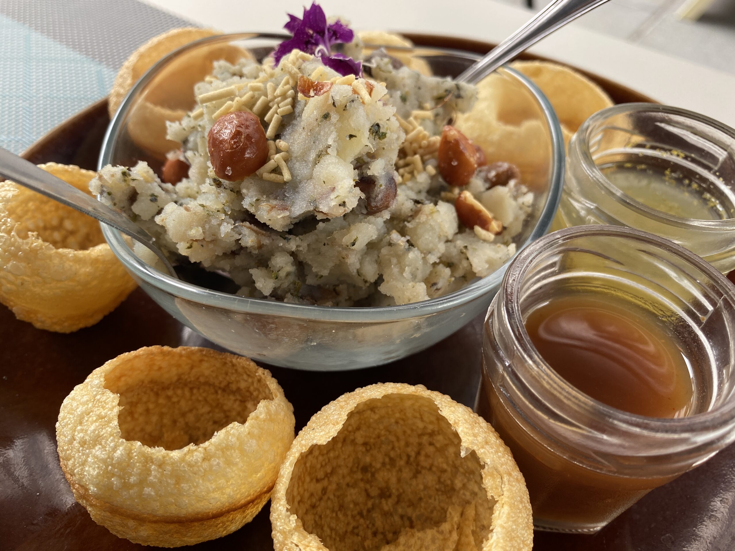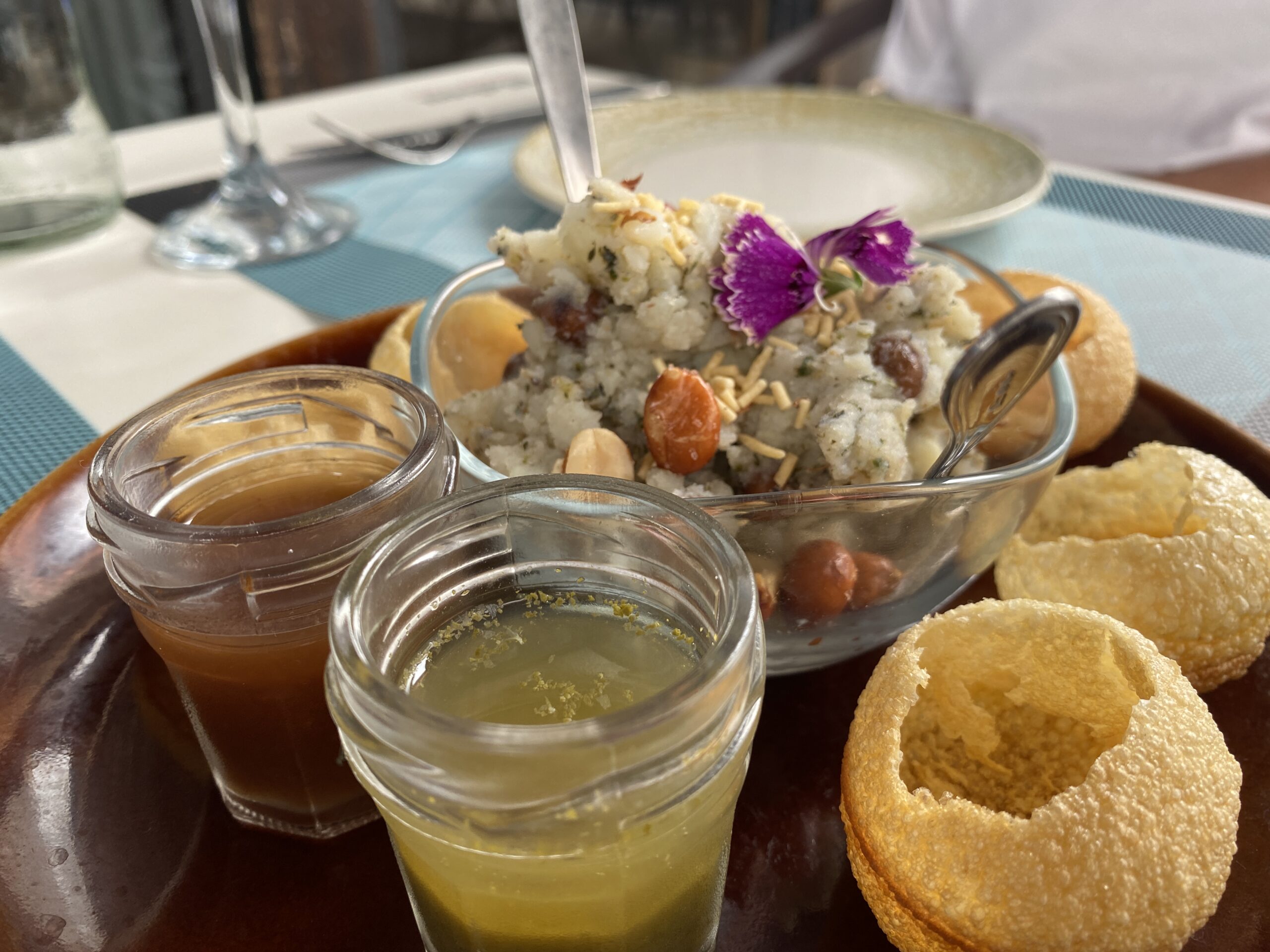 To follow that we had the famous Indian street food called " Pani Poori”. This is mashed potatoes mixed with chickpeas and Indian Masala (not spicy), coriander and peanut, served with two sauces - mint sauce and date with tamarind sauce. This was a new experience for me and one I would come back for!