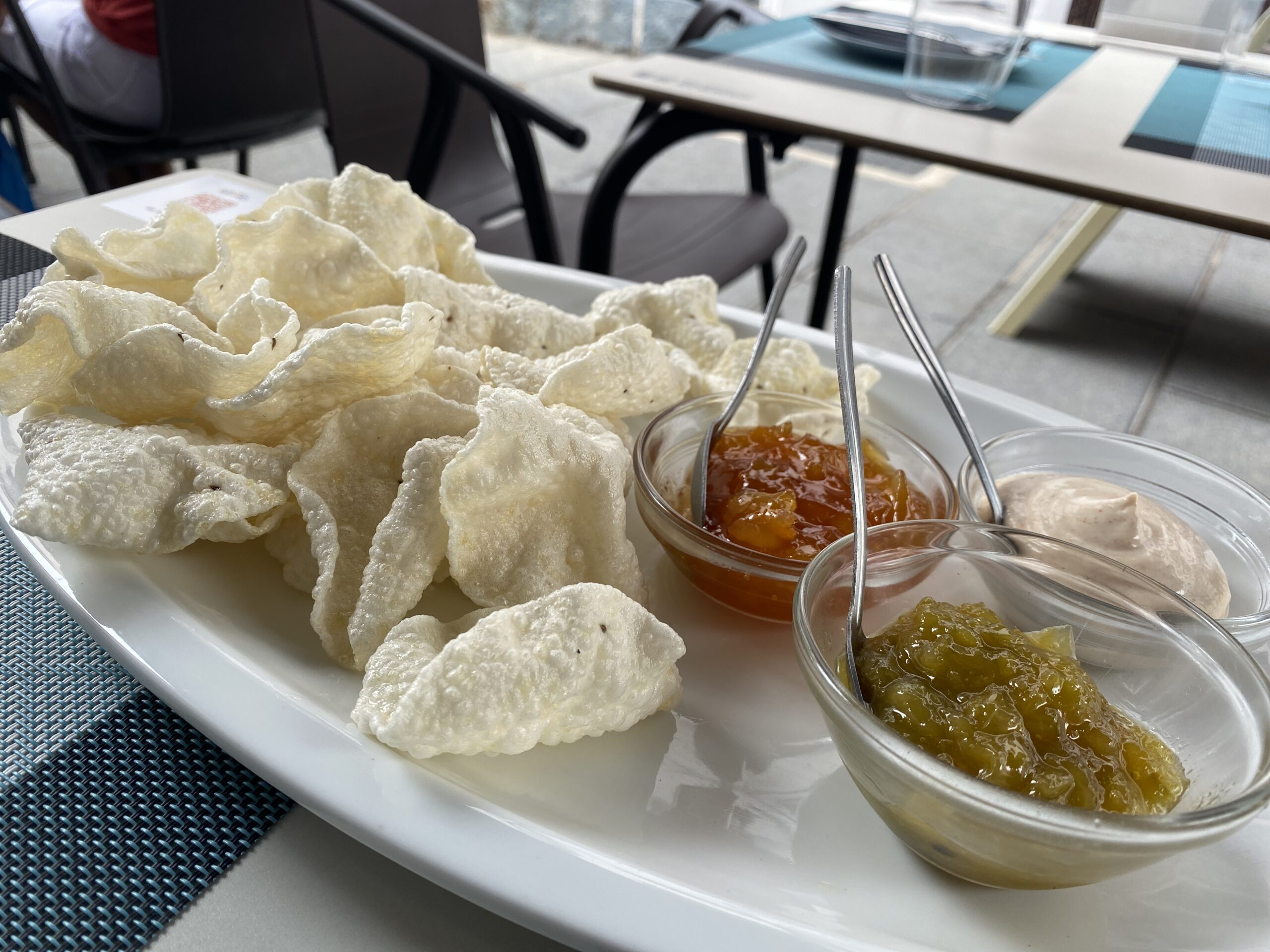 The platter does change each time and in accordance with what has been freshly cooked, but for our visit, the platter consisted of a starter of rice poppadoms with carom seeds served with pickles and chutneys.
