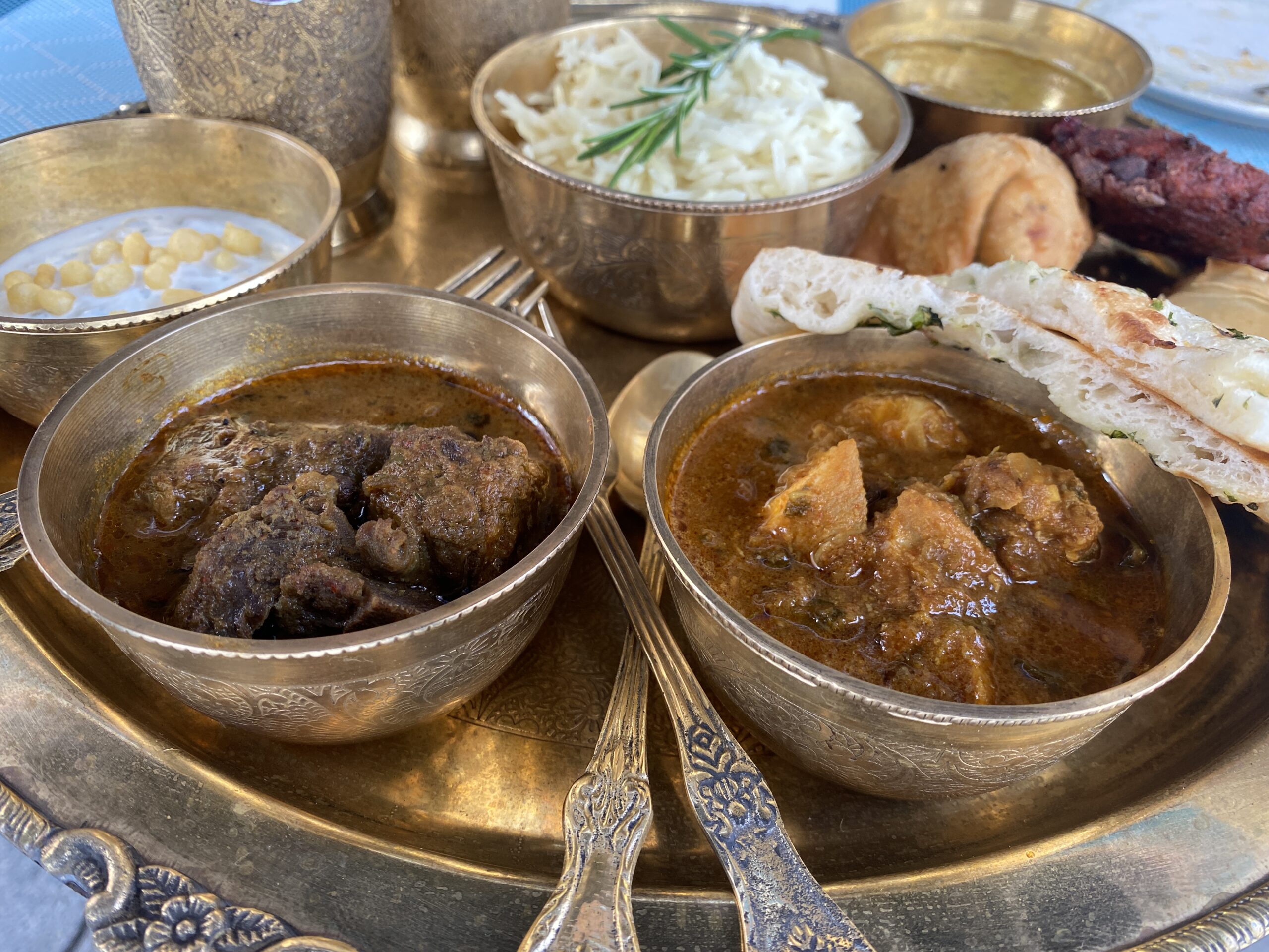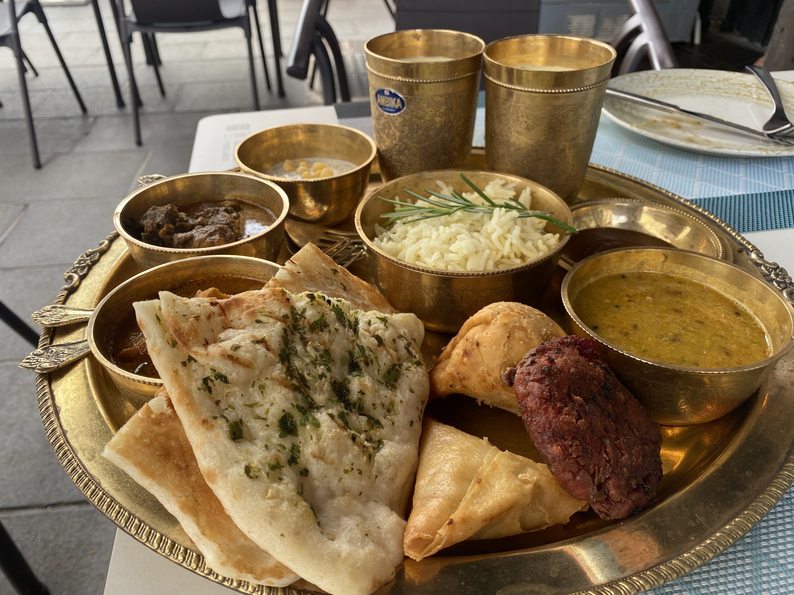 Our main Thali platter come with samosa, beetroot and sweet potato Tikki and three different currys - canarian goat, chicken curry and Dal, served with naan bread and rice. Rayta and mango lasi to cool you down if you feel spicy.