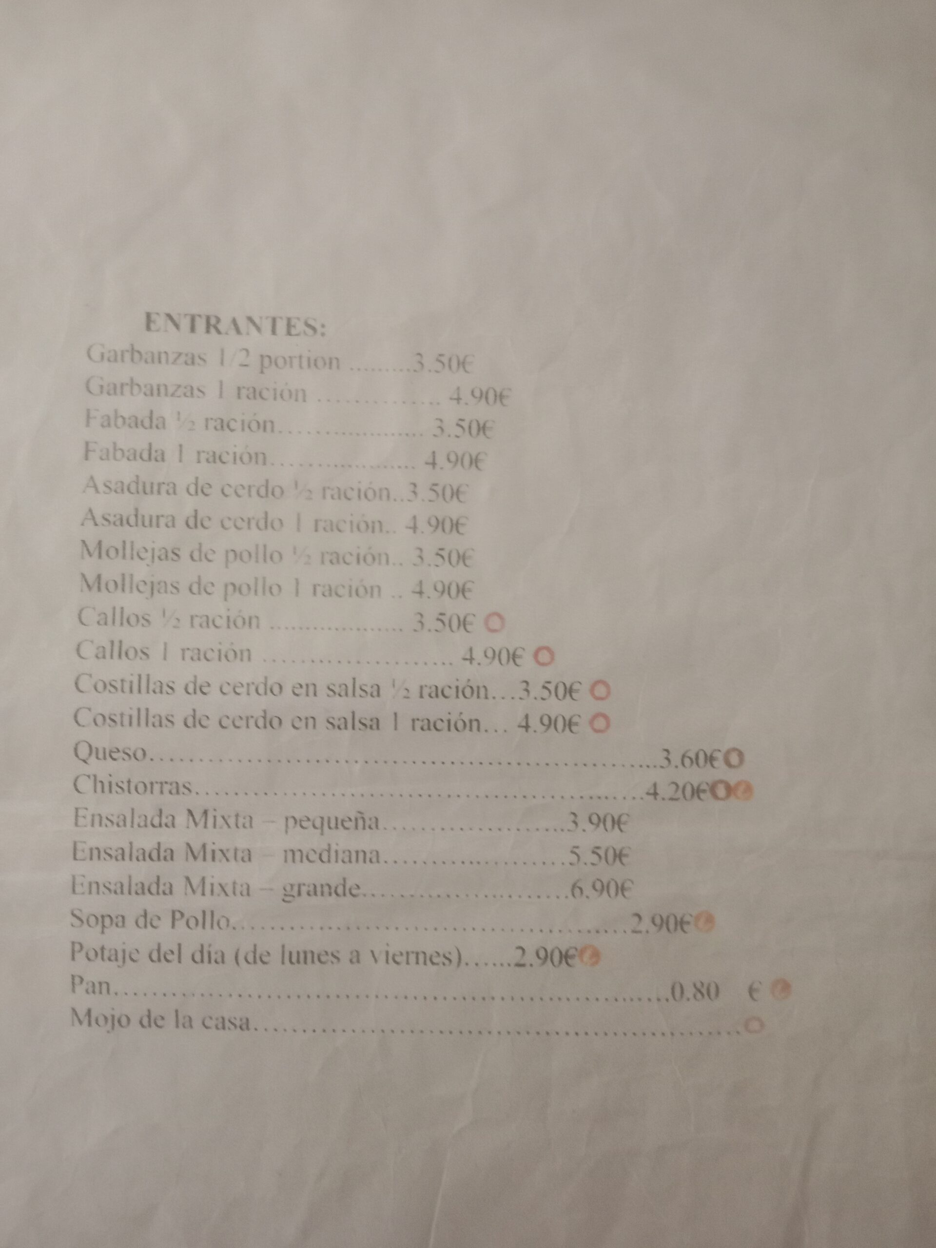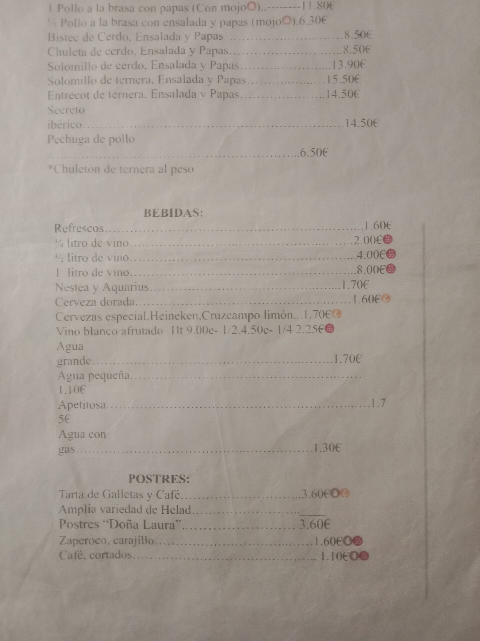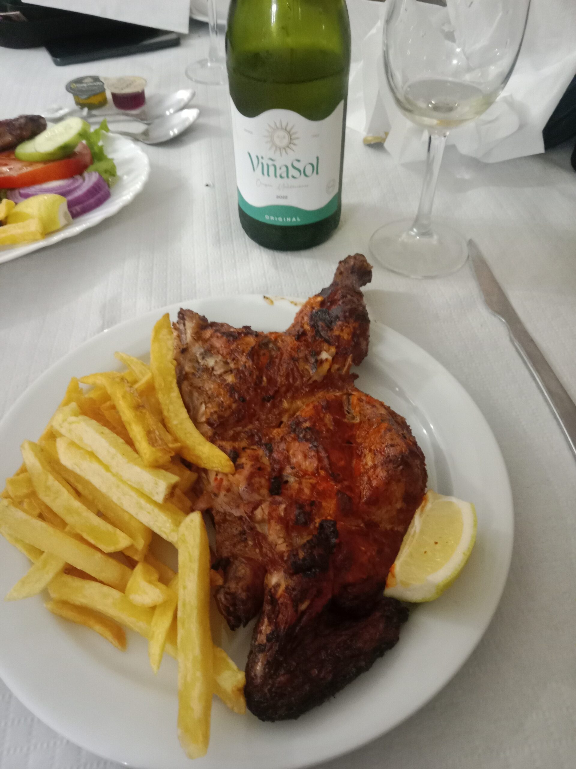 I had half a chicken with chips, the other half had a pork chuleton (a large size chop) served with chips and salad. The food was well cooked and tasted fantastic. We declined a dessert, but our whole bill with a bottle of wine was 23 euros.