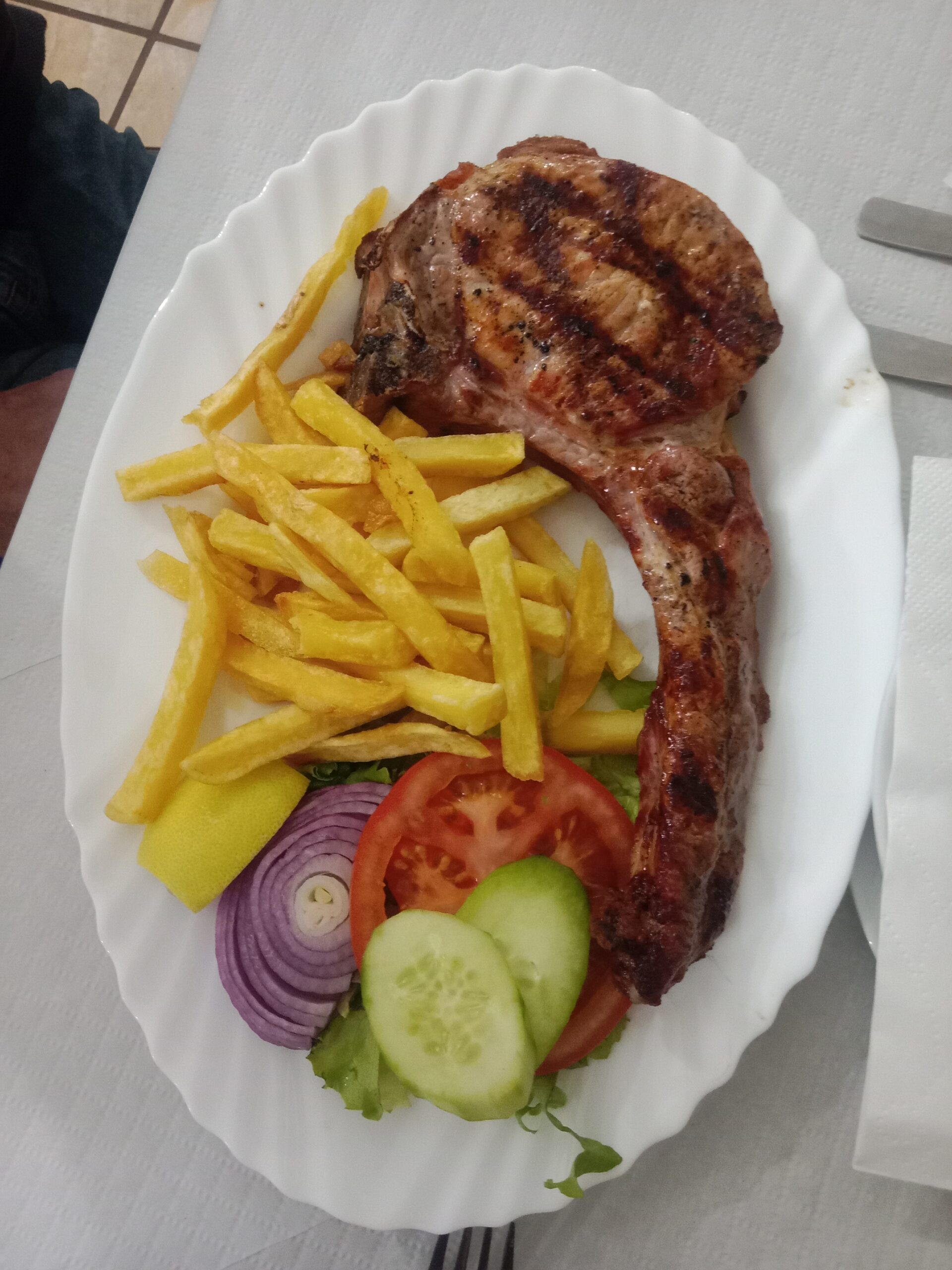 The menu itself is basic – chicken, pork or steak – all served with chips! Some meals do come with salad, but it is really only a garnishing. If you want a salad, I suggest you order one separately.